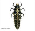 Adult: 4mm to 5mm in length. Body is maroon-brown with 14 pale cream spots. The pronotum is the same maroon-brown colour but with small cream coloured 'commas' on the back edge. The legs are reddish-brown.