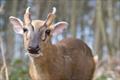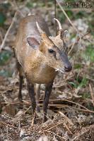 Small reddish-brown deer. Black frontal stripes across the face with conspicuous white underside to tail. Tail held vertically and prominent when alarmed (Chapman, 2008). Short antlers and upper canines protrude from the mouth in males. (Chapman, 2008).