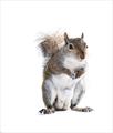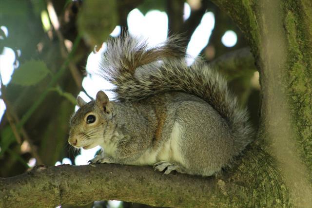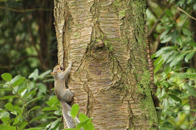 Small arboreal mammal, larger than red squirrels, predominately grey in colour and lacking the prominent ear tufts of red squirrels.