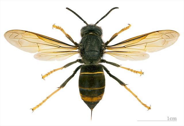 - Abdomen mostly black except for yellow band across the 4th segment with orangey-coloured lower segments.