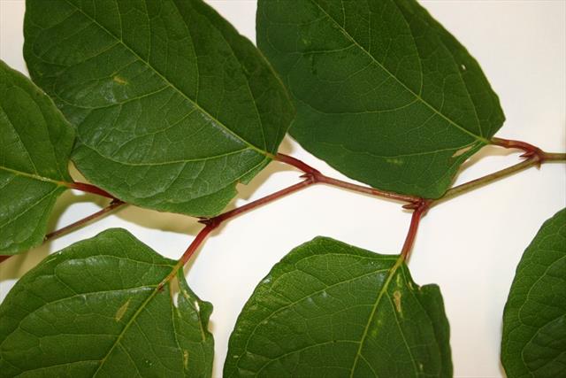 Tall, vigorous herbaceous perennial, growing in dense patches up to 3m tall (shorter than F. x bohemica & F. sachalinensis), with distinctive red bamboo like stems (Booy et al., 2015). Leaves 10-15cm long, shield shaped with a flattened base and lacking hairs on the underside (Booy et al., 2015). See also Fallopia x bohemica and Fallopia sachalinensis.