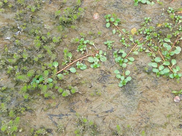 "Creeping water primrose is a creeping or floating aquatic perennial herb that sometimes forms mats. Stems and leaves are usually glabrous or sometimes sparsely pubescent. The leaves are alternate, simple, and net-veined. Leaves of the floating stems are oblanceolate to spatulate, or sometimes orbicular in shape. Stems bearing flowers are usually weakly upright with lanceolate to narrowly elliptic leaves. Leaf petioles are 1 to 5 cm long. Flowers are axillary, perfect, and solitary on stalks 1 to 5 cm long. The five petals of the flower are yellow. The fruit is a cylindrical capsule with numerous seeds. Seeds are ellipsoid, yellowish, and less than 1 mm long." (USACE-ERDC 2009).