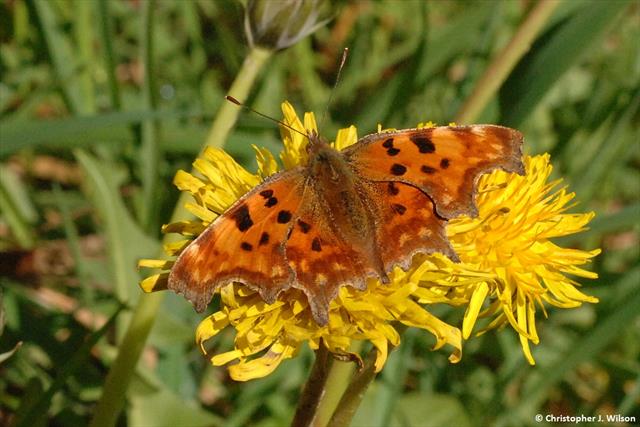 Generalist, found in: tall-herb and grassy forest clearings, crops, field margins, orchards, urban parks and ornamental gardens. The first confirmed report of the Comma in the Republic of Ireland was in 2000 in Co. Wexford (O'Donnell & Wilson, 2009). It is now consistently recorded each year throughout the south and east, and in 2014 it was confirmed to be overwintering in Co. Carlow (Harding & Power, in press). In Spring, overwintering adults emerge in wooded habitats and spend time basking, favourite surfaces being tree trunks, wood piles, dead bracken and fence posts. Males establish territories on sunny rides and woodland margins, perching waiting for females to enter the territory and conducting short flights to and from their original perch. During late summer and early autumn, the 2nd generation adults range widely over sites with nectar sources, but move to woodland to hibernate (Bond & Gittings, 2008).